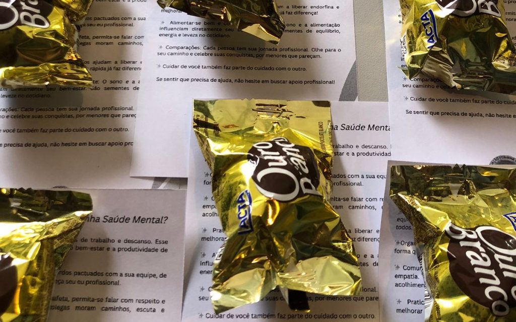 Ao final da atividade, todos os participantes receberam um mimo da OS Gota de Leite, um bombom acompanhado de um pequeno texto de orientação para os cuidados da saúde mental e emocional que devem ser lembrados no dia a dia.