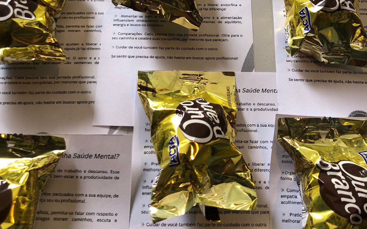 Ao final da atividade, todos os participantes receberam um mimo da OS Gota de Leite, um bombom acompanhado de um pequeno texto de orientação para os cuidados da saúde mental e emocional que devem ser lembrados no dia a dia.